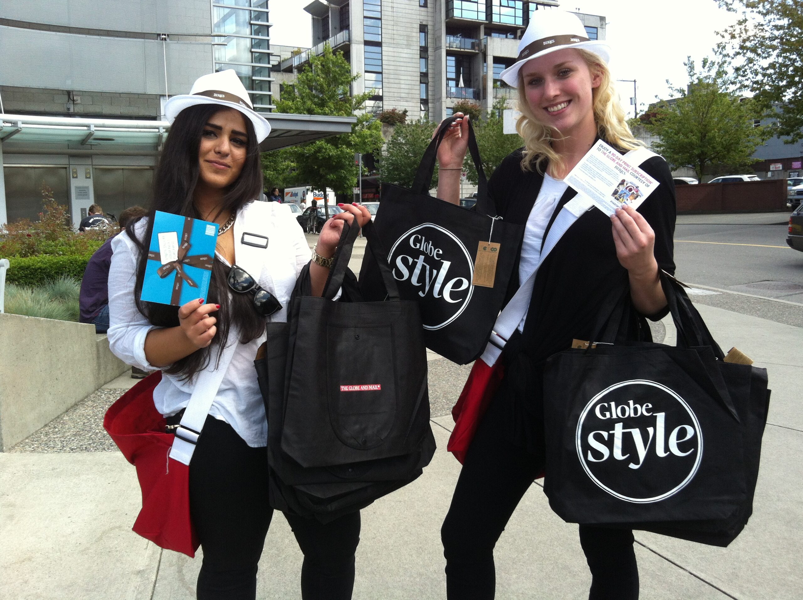 Along with the risk-free 3-month subscription, Splashers in downtown Toronto, Montreal and Vancouver were handing out copies of the Globe Style Advisor, a fashion magazine that comes inside select issues of The Globe and Mail newspaper. Splash girls were also giving out the latest Birks jewellery catalogues and promoting a $50 off at Birks discount, as well as a contest to win a Birks necklace. If that wasn’t enough already, all of these gifts were handed out inside convenient “Globe Style” reusable grocery bags.