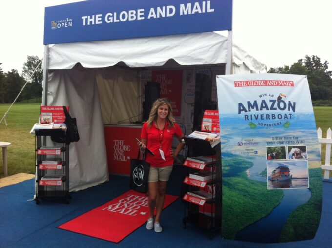 Splash MM also utilized their technology driven knowledge to arm their brand ambassadors with Ipads. Each consumer was entered for a chance to win a grand prize trip to the Amazon provided by G Adventures and Copa airlines. For those that wanted more of an experience, pictures were taken to mimic the front page of The Globe and Mail featuring headlines, photos and information that was sent to each person’s email to view after the event. With such a large crowd gathering each day thousands of golf enthusiasts were pleased with the experience they had at the Globe and Mail booth and Splash MM brand ambassadors.
